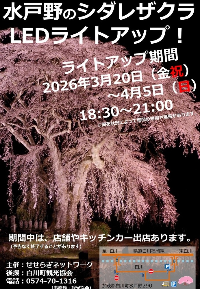 毎年、咲き始めから満開を過ぎる頃まで、夜にライトアップされ、水を張った田んぼの水面に浮かぶ鏡桜も必見。